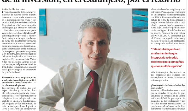 Software Management Transportation LogisticsDeja un comentario El Vigía, Semanario Logístico, entrevista a Víctor Vilas, Director Desarrollo de Negocio de AndSoft 9 de febrero de 201514 de mayo de 2015 AndSoft Software Gestión Transporte TMS y Portales Blockchain, eCMR, TrackAPP Alone Continúa leyendo El Vigía, Semanario Logístico, entrevista a Víctor Vilas, Director Desarrollo de Negocio de AndSoft