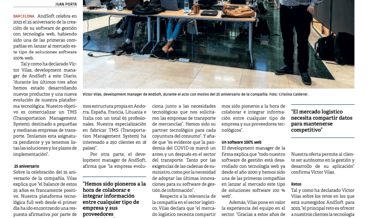 Los periódicos y revistas de transporte y logística informan sobre la evolución tecnológica de AndSoft en 25 aniversario